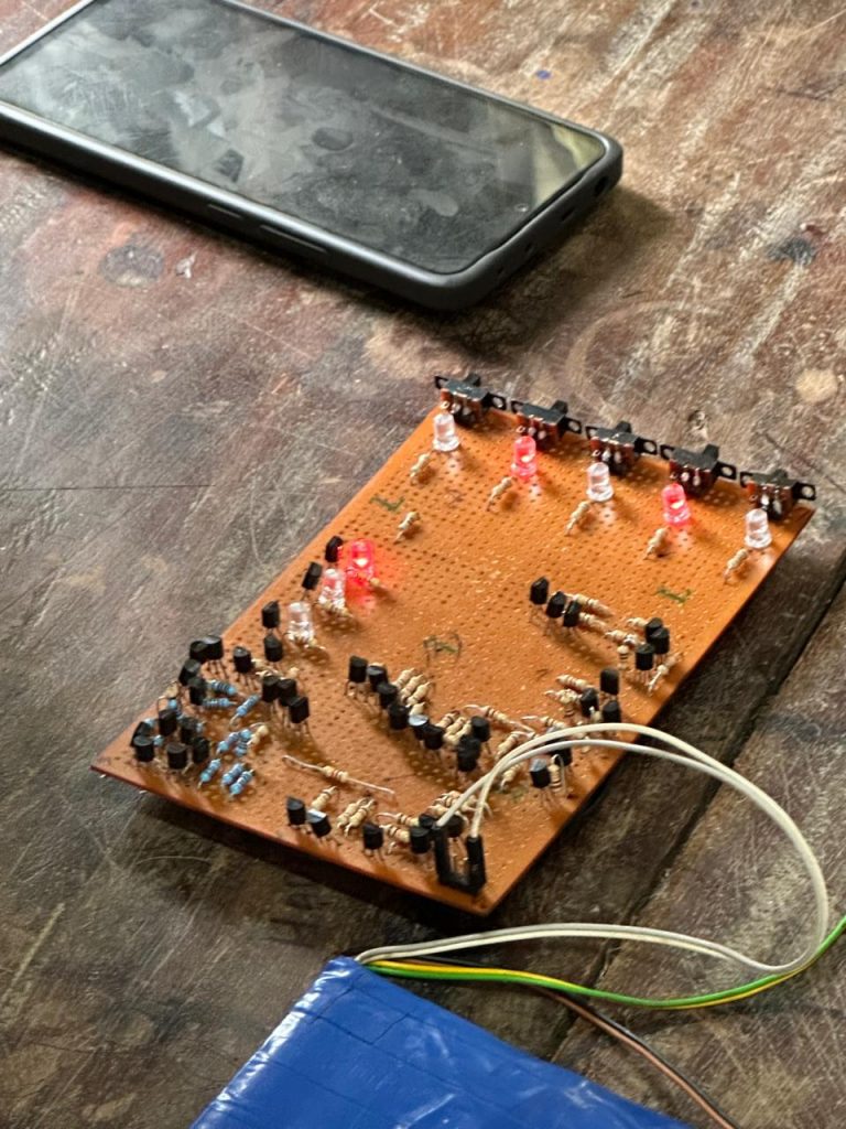 Details: The project featured an implementation of a two-bit adder using 41 transistors and 67 resistors, designed entirely with discrete components. Despite the complexity, the circuit functioned flawlessly, demonstrating an excellent grasp of transistor-level digital logic design.