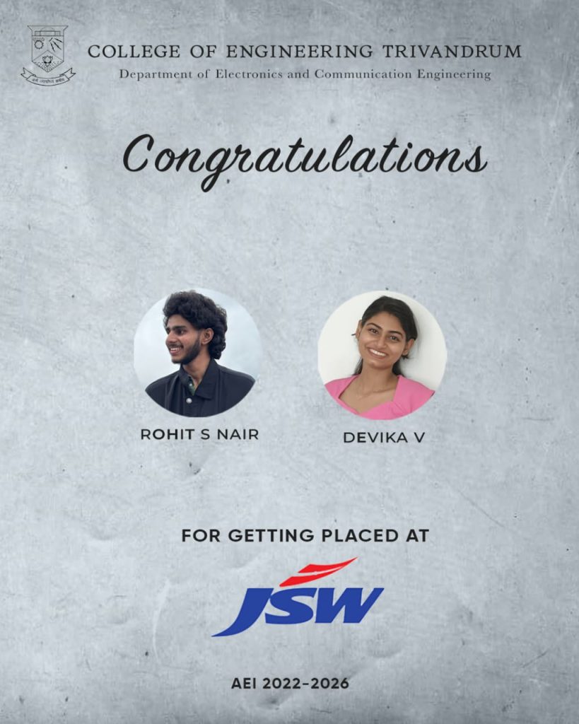 Neeraj Ninan Kuriakose (TVE22EC048), a final-year B.Tech ECE student from CET has secured a prestigious placement at Texas Instruments, a global leader in semiconductor design and manufacturing. His success in the Digital Design domain highlights the department’s strong foundation in core electronics and its commitment to nurturing industry-ready talent. This achievement reflects the collective effort of the faculty, curriculum, and student excellence within the ECE department.