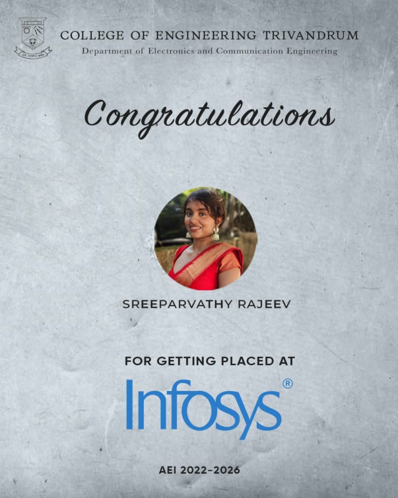 Tinu K Cheriya (TVE22EC064), a final-year B.Tech student from the Department of Electronics and Communication Engineering at CET, has earned a coveted placement at Texas Instruments, a renowned leader in embedded systems and semiconductor innovation. Selected for the Embedded Software role, Tinu’s success underscores the department’s emphasis on hands-on learning, systems-level thinking, and strong fundamentals in electronics and programming. His achievement is a testament to the department’s continuous efforts to align academic rigor with industry expectations, preparing students to excel in cutting-edge technology domains